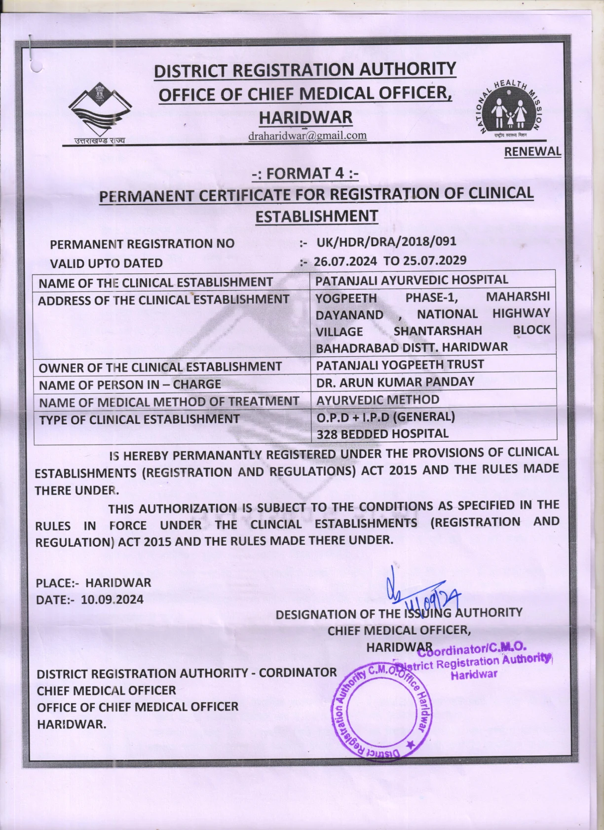 Patanjali Ayurved Hospital has been assessed and found to comply with NABH accreditation standards for AYUSH Programmes. This certificate is valid for the Scope as specified in the annexure subject to continued compliance with the accreditation requirements.